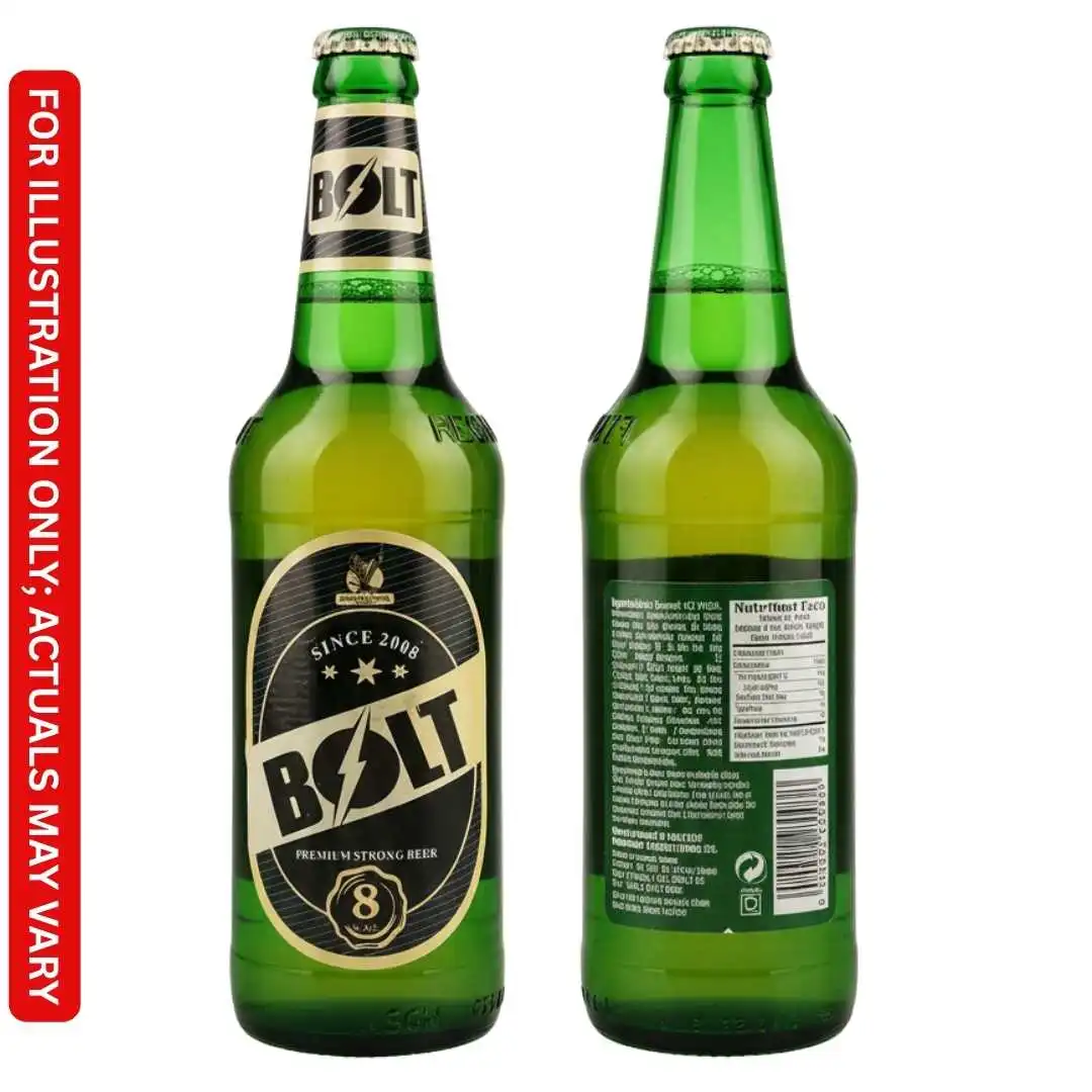 BOLT Premium Strong Beer is available in various sizes, catering to different consumption preferences. The typical packaging includes bottles and cans.