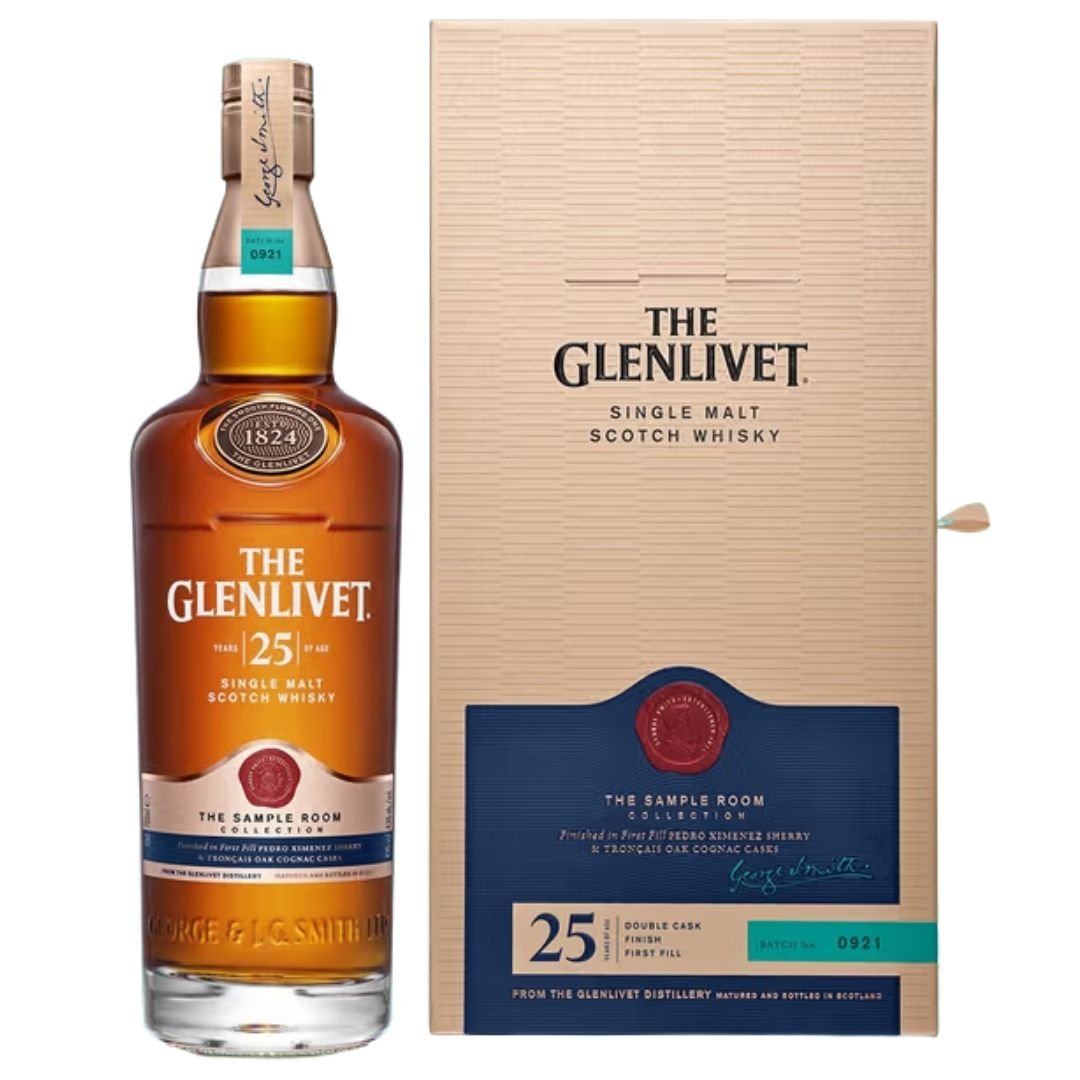 The Glenlivet 25 Years Old is matured predominantly in ex-bourbon barrels and finished in first-fill Oloroso sherry casks, offering an elegant and rich single malt with complex layers of fruit, spice, and oak.