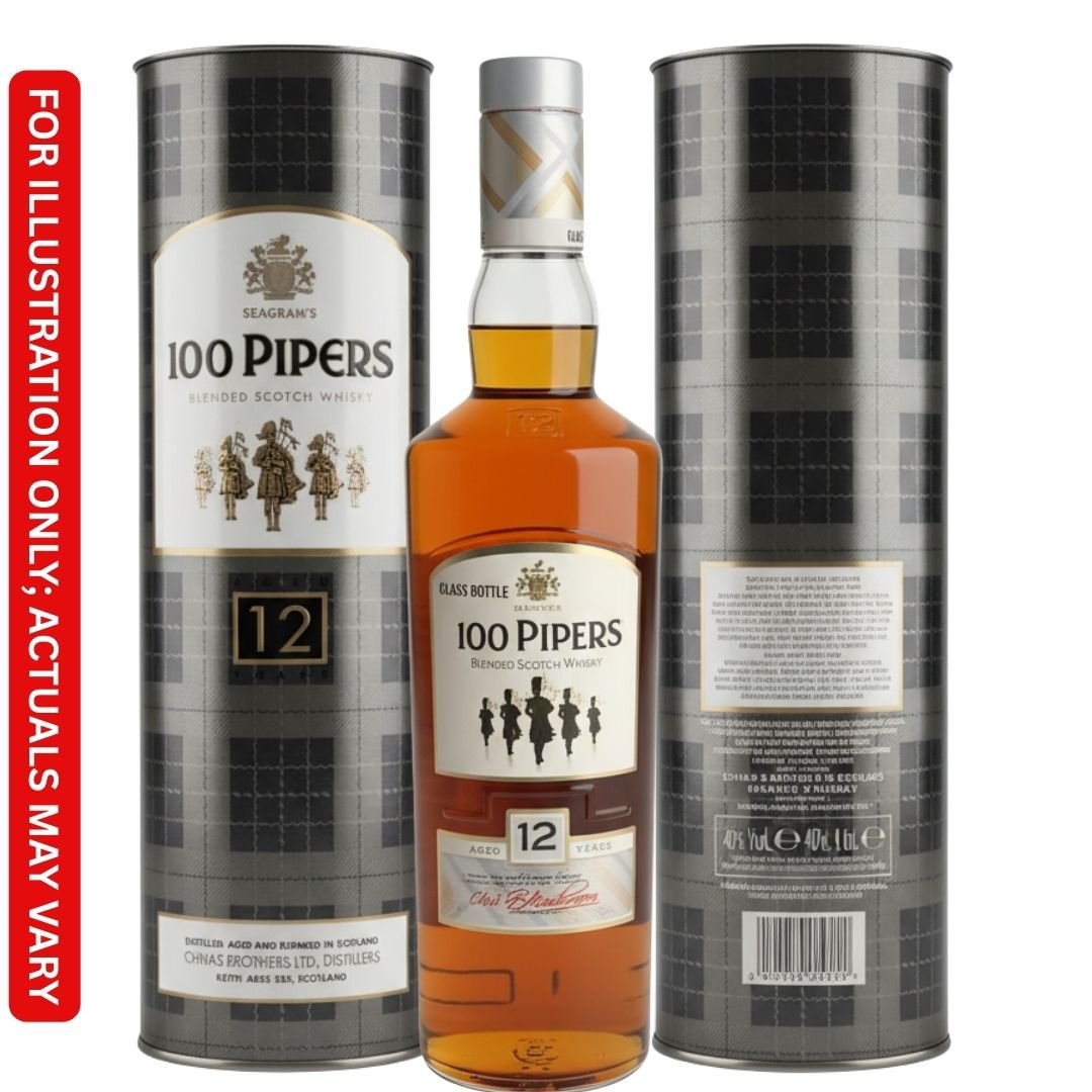 100 Pipers 12 Years Old is a popular blended Scotch whisky that is well-regarded for its smooth, well-balanced character. Produced by Chivas Brothers, part of the Pernod Ricard group, the whisky is blended and bottled in Scotland. The malts used in the blend originate from various distilleries, particularly in the Speyside region. 100 Pipers is recognized for its high malt content, subtle smokiness, and its popularity in the Indian market.