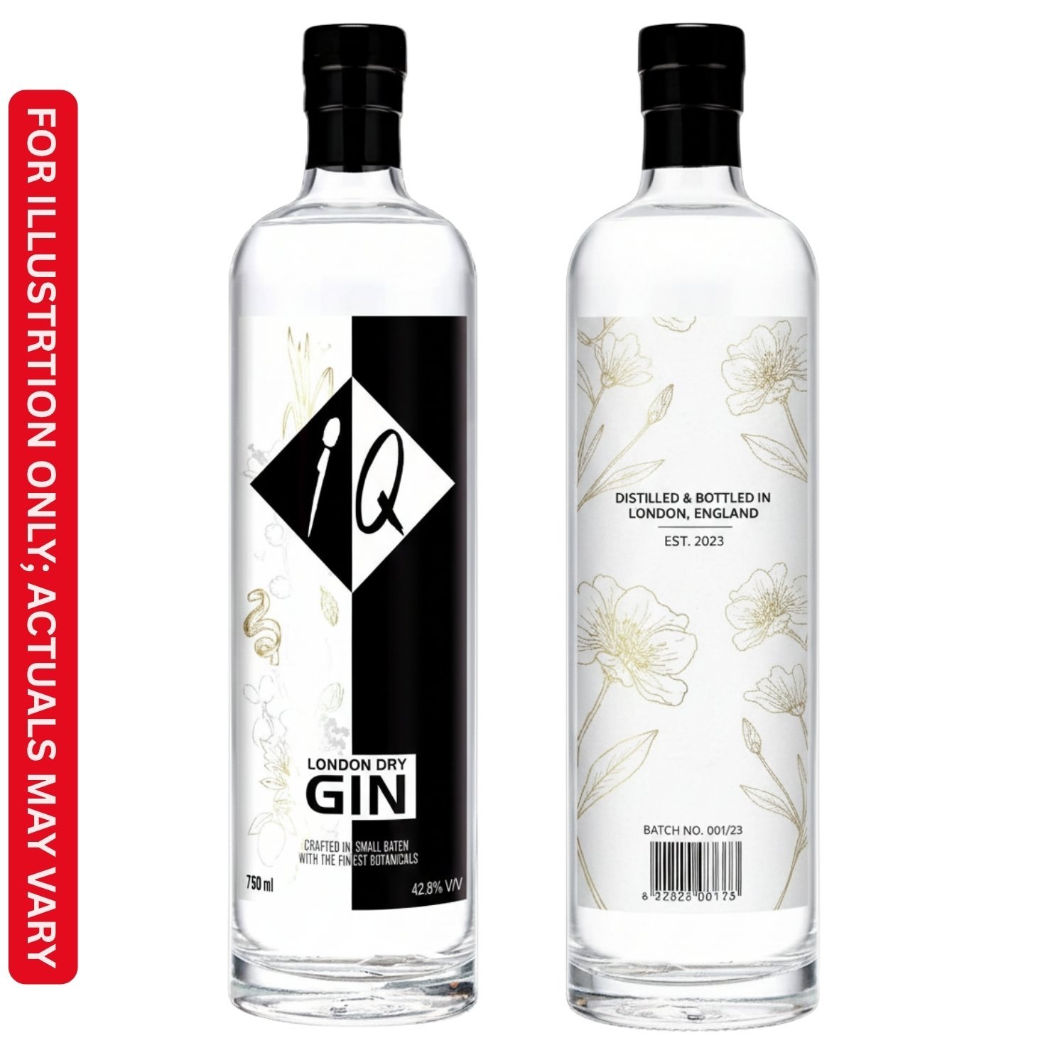 The label of IQ London Dry Gin reflects its premium nature, designed with elegance and simplicity, highlighting its traditional gin-making roots.