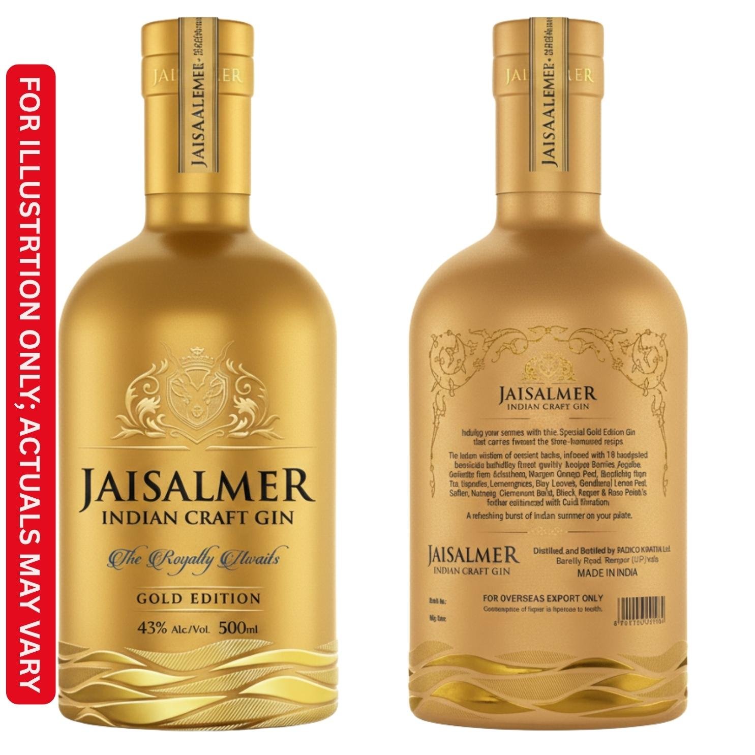 The label on Jaisalmer Gold Edition embodies luxury, reflecting the sophisticated nature of the gin. The packaging highlights the golden silk filtration process and premium ingredients.
